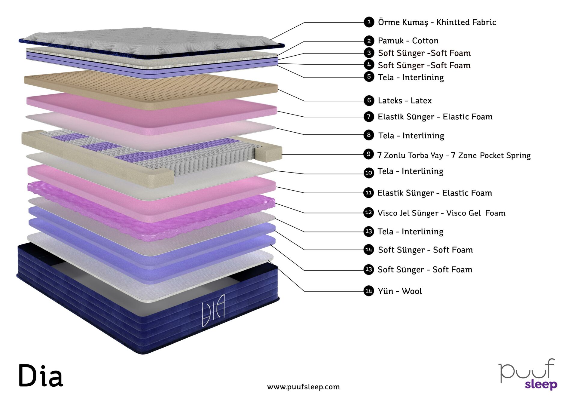 Maksimum konfor arayışında olanlar için özel olarak tasarlanmış Dia, lateks ve visco konforunu tek yatakta sizlere sunmaktadır. Çift taraflı kullanım imkânı sunar. Lateks ve visco katmanın arasında bulunan 7 zonlu paket yay sistemi yatağın çift taraflı olan üst katmanlarında kullanılan lateks ve visconun konforunu yükseltmektedir. Nasıl mı? Kullanılan lateks ve visco süngerin zon sistemi olmadığı için vücudu desteklese dahi paket yayın sunmuş olduğu 7 zon desteğini sağlamaz. Paket yaylar birbirinden bağımsız çalışır. Vücudun farklı bölgelerine birbirinden bağımsız olarak destek sağlar. Vücut ve omurga yapısına en uygun desteği sunar.