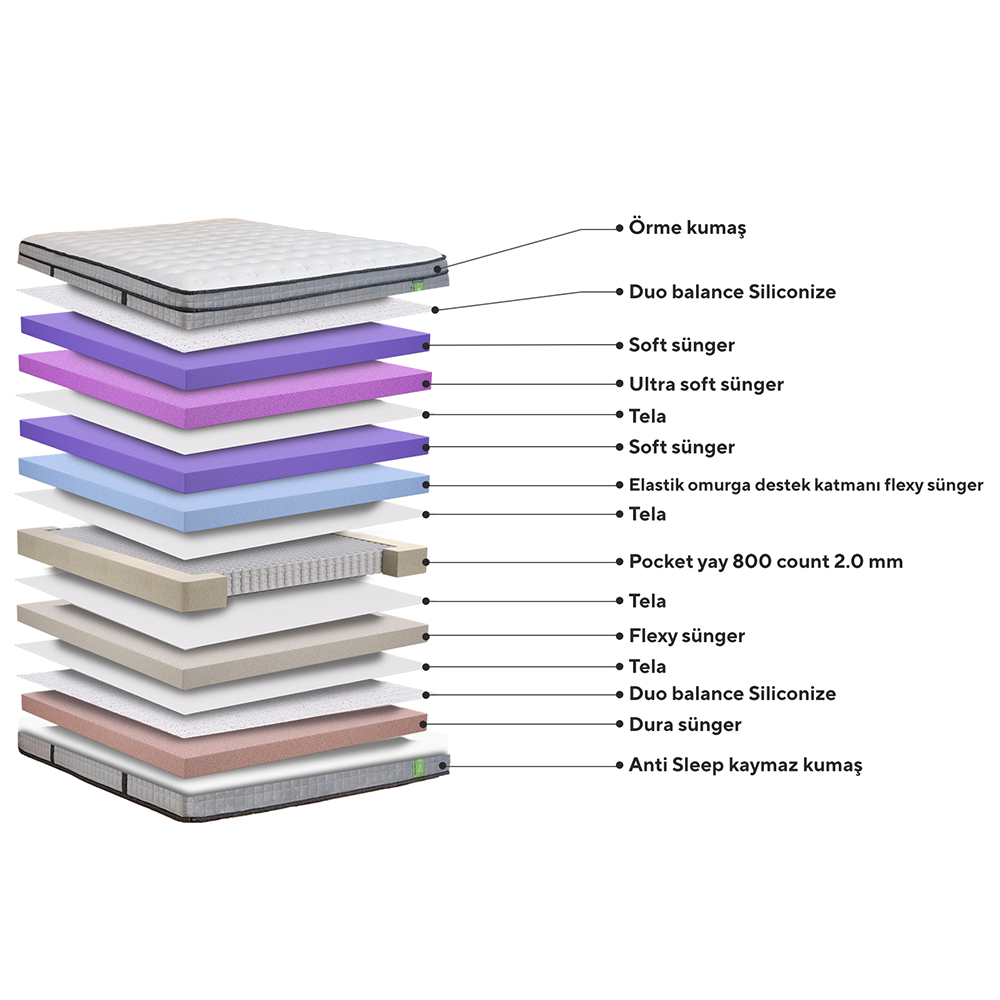 Yatağımızın hemen altında bulunan soft sünger, uyku esnasında sizi saracak bir konfor sunar. Gözenekli yapısı, hava akımının sürekli devam etmesini sağlar ve böylece kötü koku, bakteri, mantar ve küf oluşumu engellenir. Bu sünger katmanı, sizi her zaman taze ve ferah bir uyku ortamına davet eder.