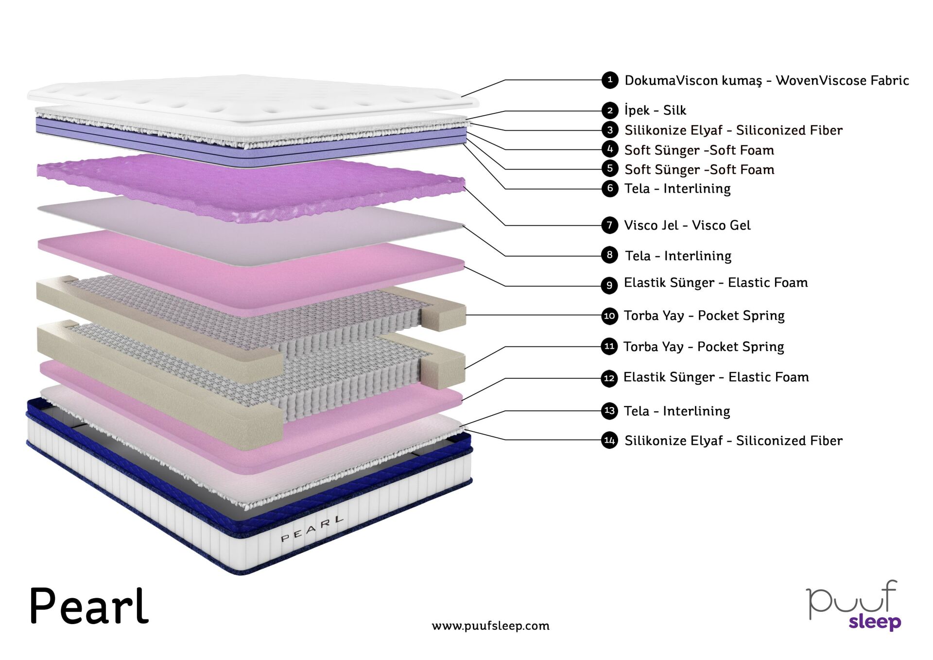 Pearl yatak, içeriğinde başlıca ipek, visco jel sünger ve paket yay bulunduran özel bir yataktır.